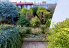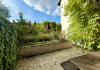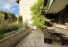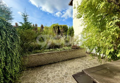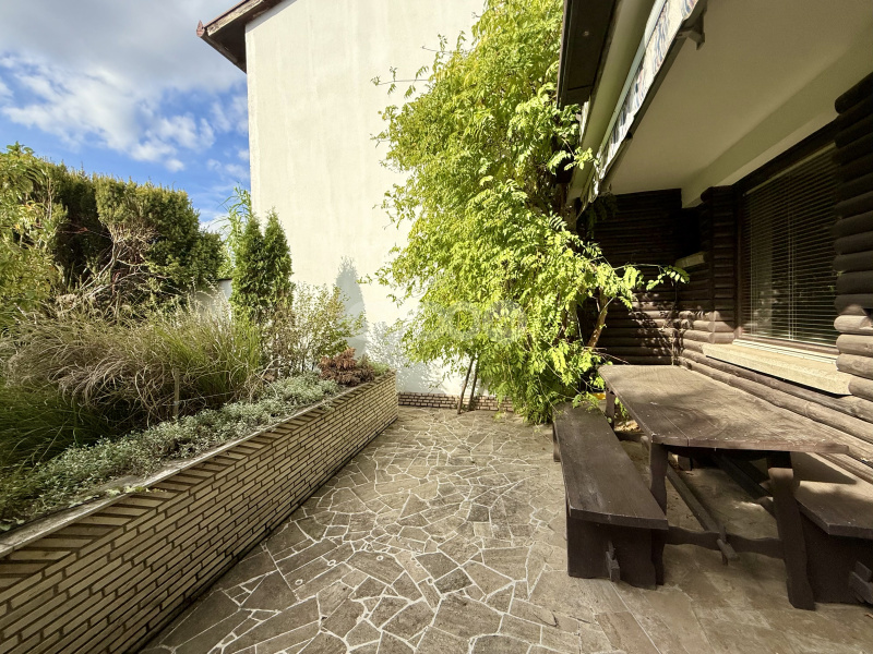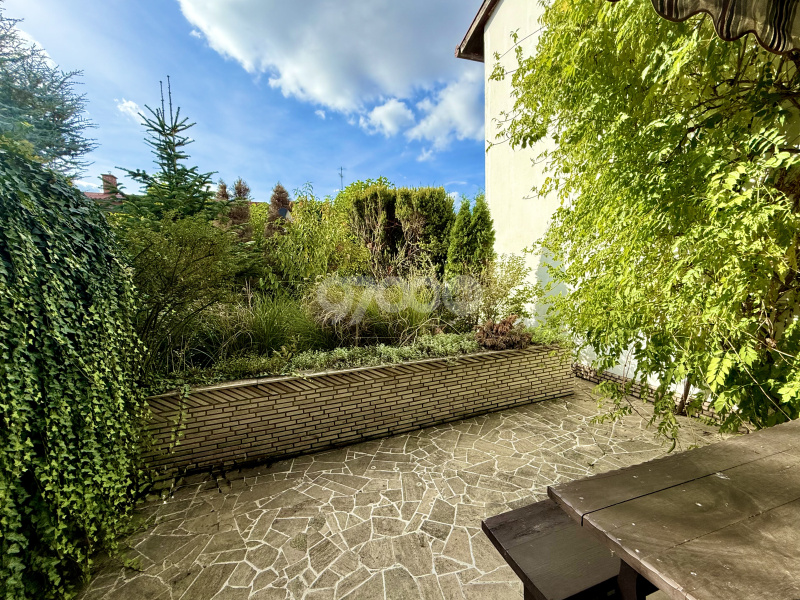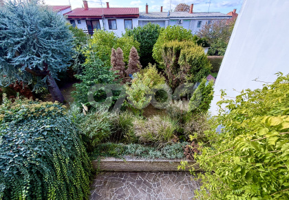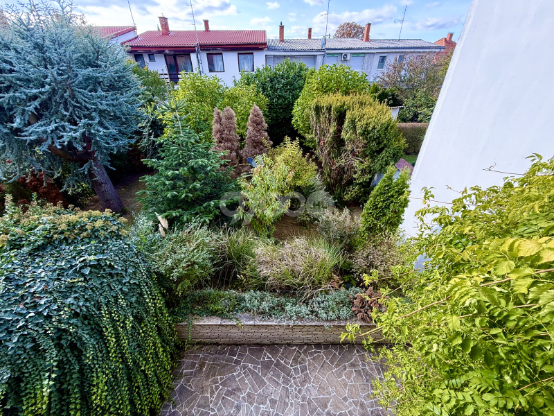 A házhoz gazdag növényzetű előkert és intim hátsókert tartozik, mindkét oldalon terasszal, az emeletről pedig a kérte néző, nyugati erkély nyílik.