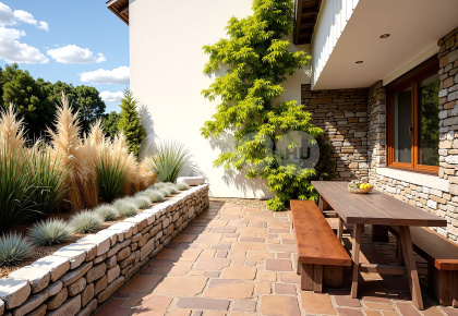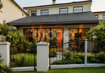 A házhoz gazdag növényzetű előkert és intim hátsókert tartozik, mindkét oldalon terasszal, az emeletről pedig a kérte néző, nyugati erkély nyílik.