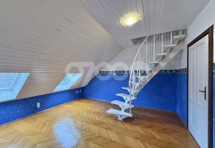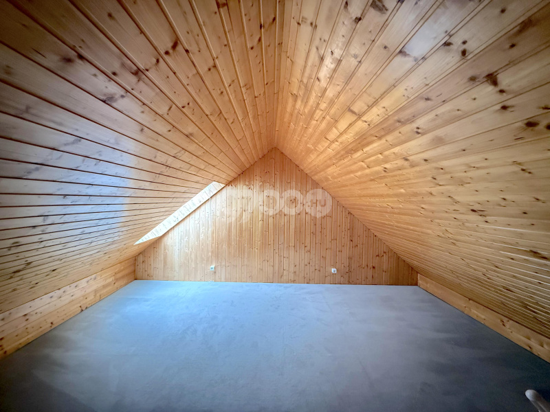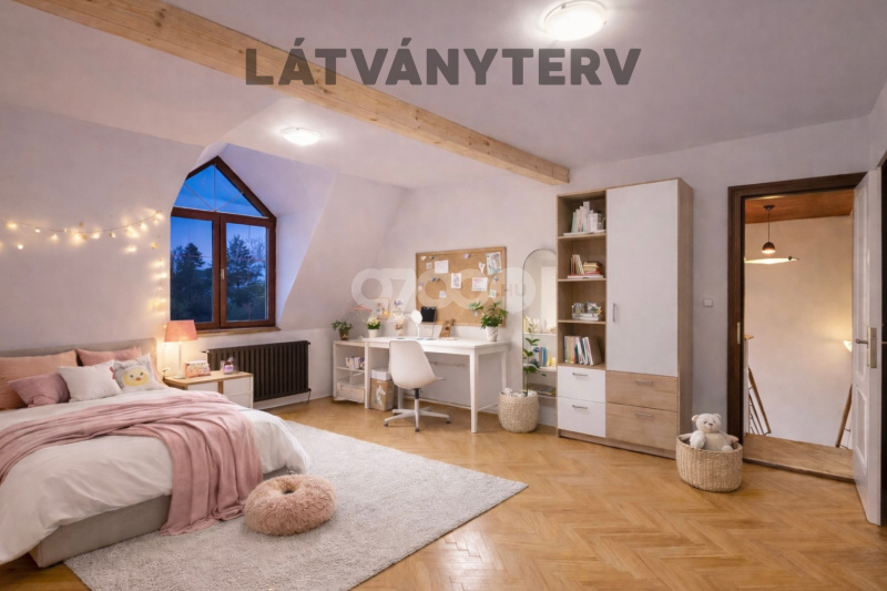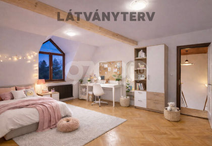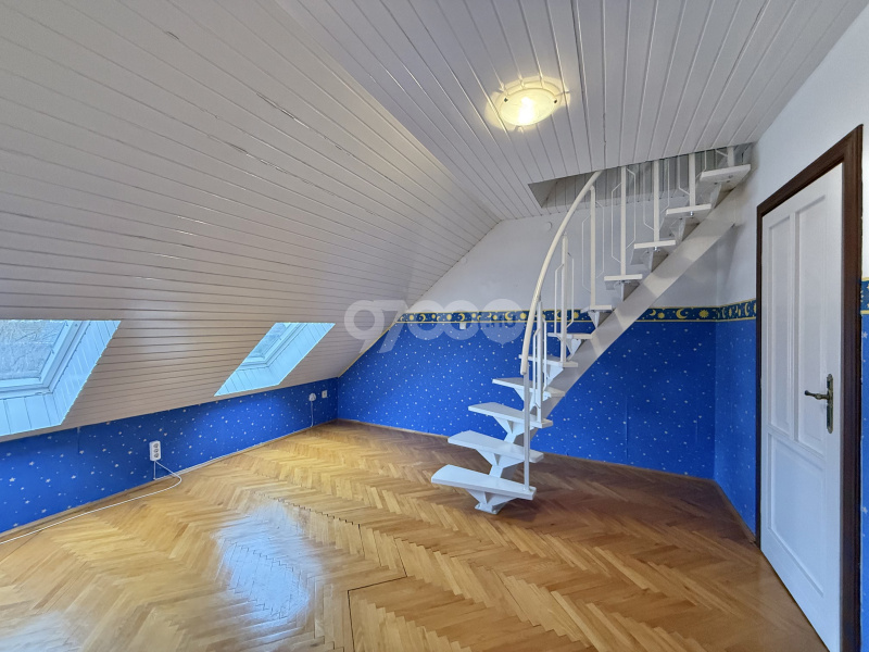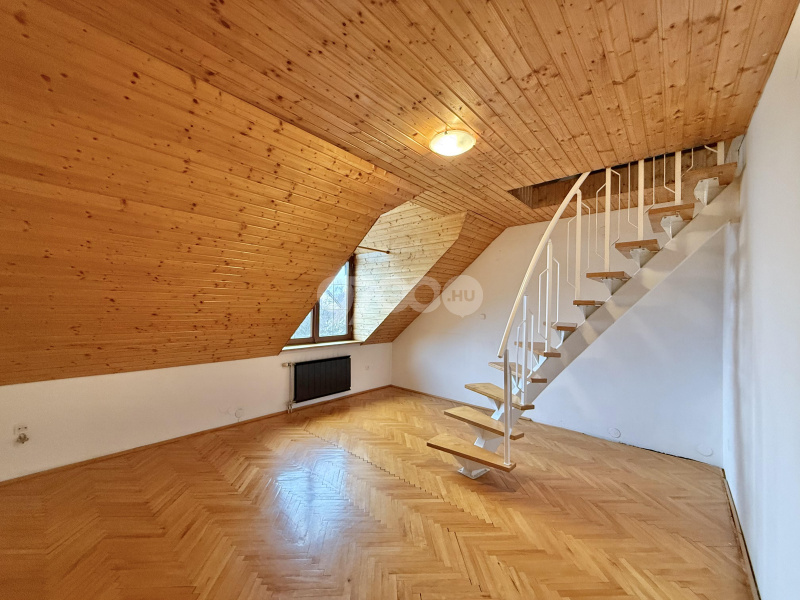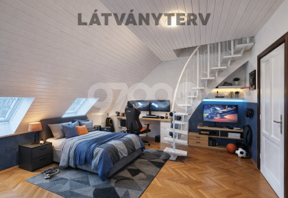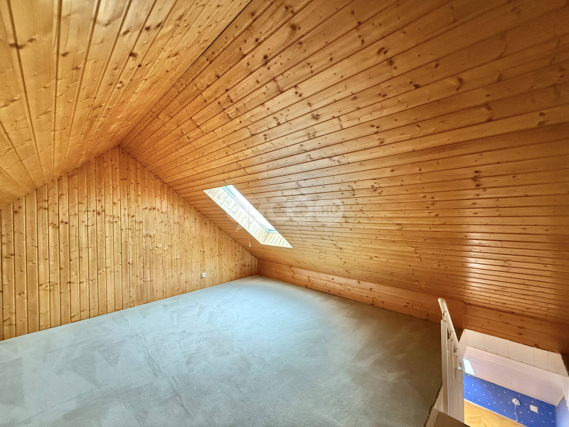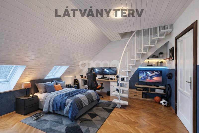 - Kettő emeleti szobából külön lépcső vezet fel a padlástérben kialakított egy-egy szobába, melyek 18 és 20 m² nagyságúak, tovább bővítve a ház életterét.