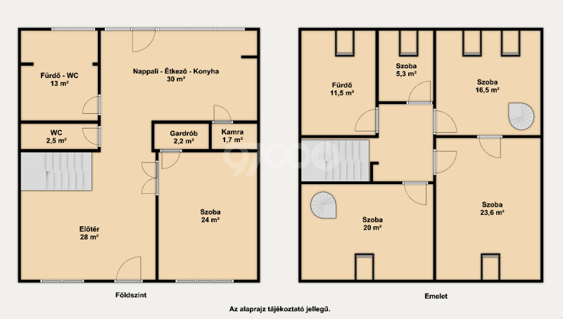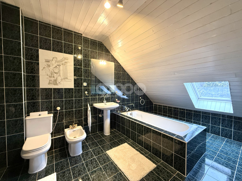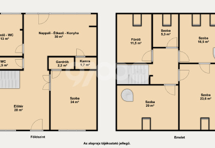 - Az emeleten további szobákat találunk: három nagyobb hálószobát, egy kis gardróbszobát, valamint egy fürdőt.