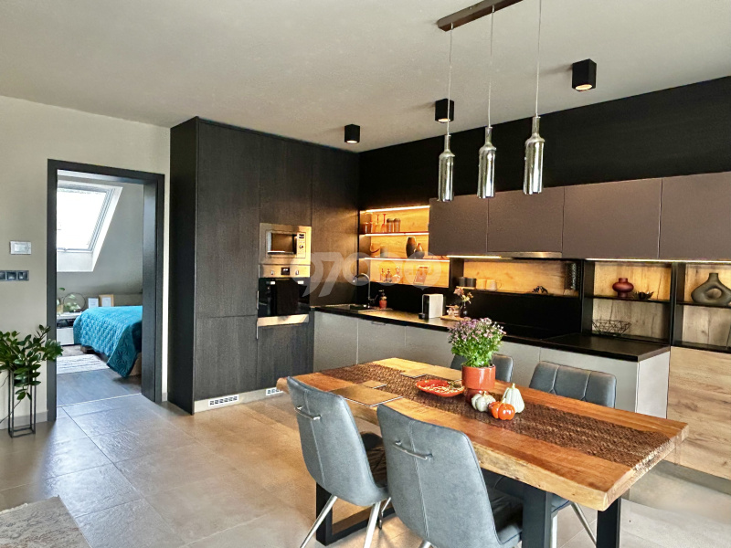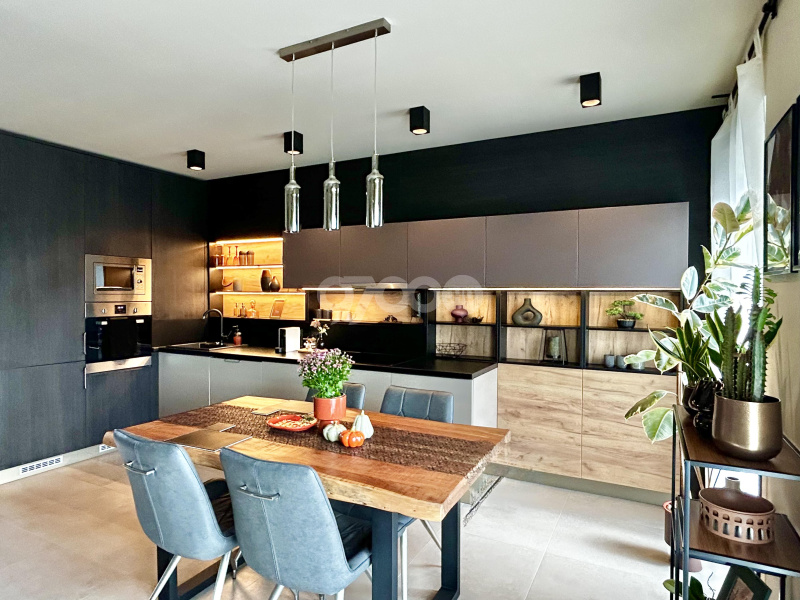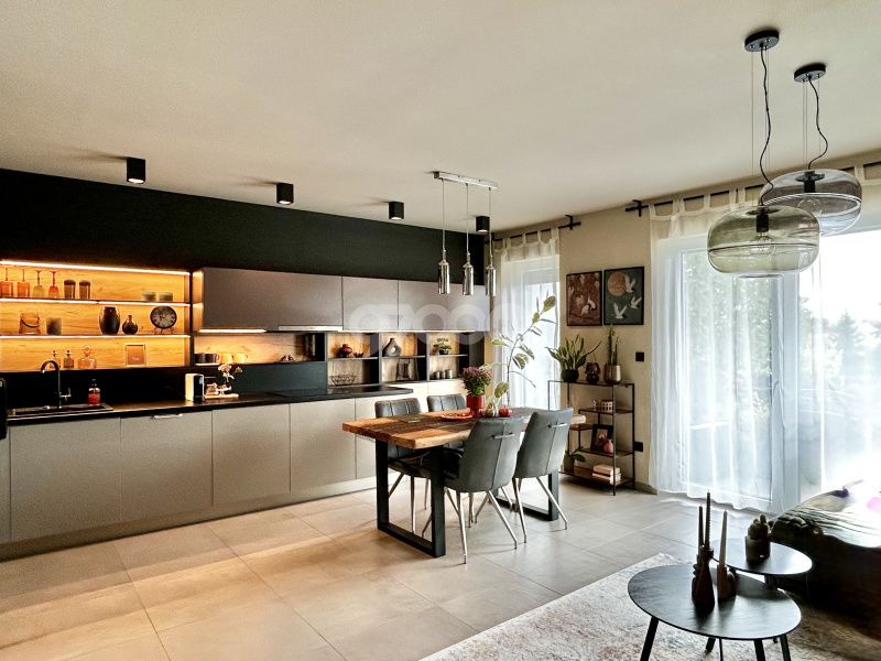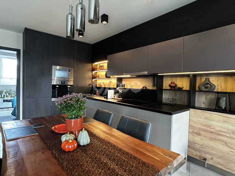 A minőségi burkolatok, beépített bútorok és a modern, gépesített konyha elegáns megjelenést és kényelmes mindennapokat biztosítanak. A világos terek és a nagy üvegfelületek kellemes, napfényes hangulatot teremtenek a lakásban.