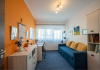 A lakás praktikus elrendezésű: a bejárat az udvaron, a lakás központi részén található, ahonnan a lakótér két részre oszlik.