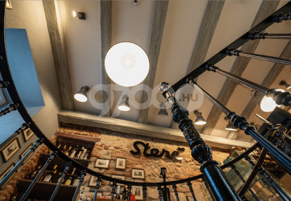 - autentikus pincehangulat + modern üzleti tér kombinációja