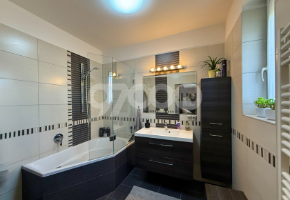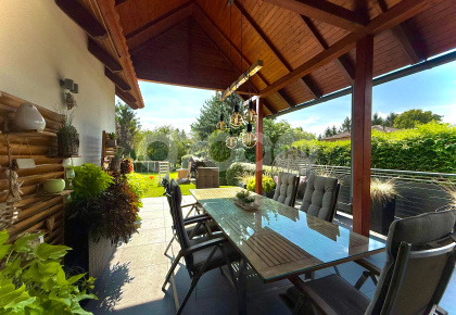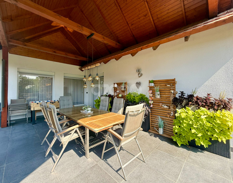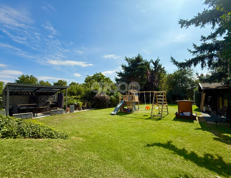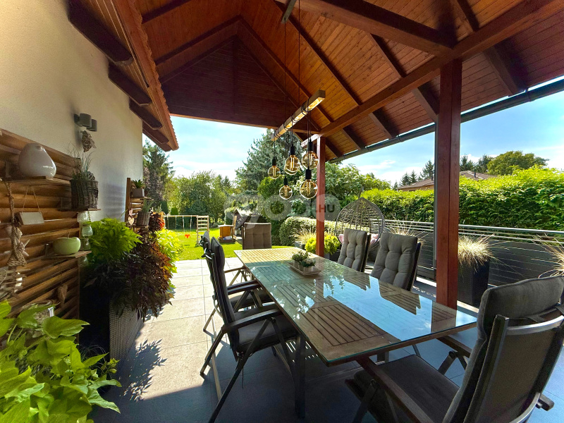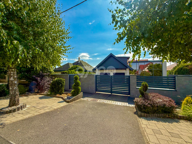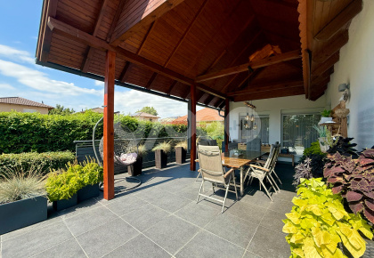 Külön említést érdemel az ingatlan parkosított kertje, mely az utcai bejárattól kezdve a leghátsó kerítésig harmonikus egységet képez, kiemelve a ház bejáratához közeli csobogót. A funkcionalitás kültéren is megjelenik: a szükséges felületeken térkő, a szabadidő természetbeni eltöltésére szépen gondozott gyep, fedett és nyitott terasz biztosít teret.