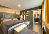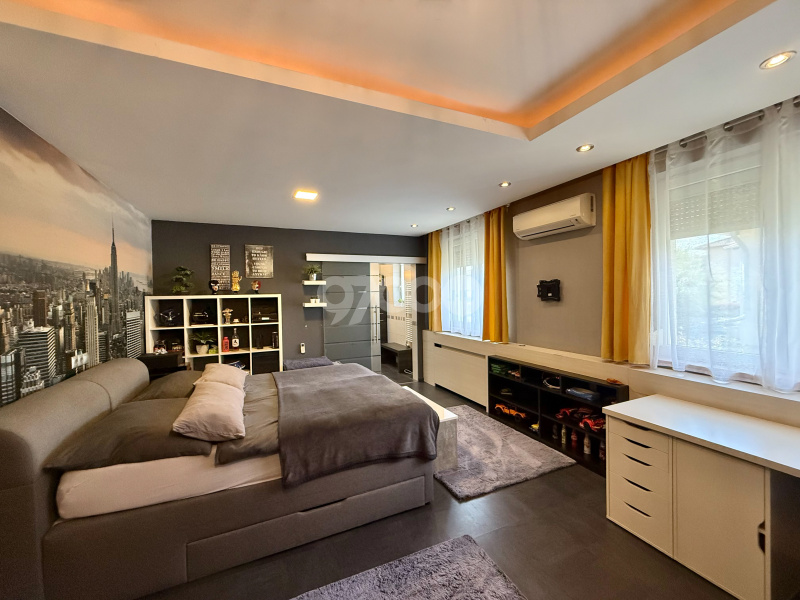 PRIVÁT ÉLETTEREK: Kettő hálószoba és egy dolgozószoba a földszinten helyezkednek el. A tágas hálókhoz külön-külön fürdőszoba tartozik, saját WC-vel, fürdőkáddal/tusolóval. A szülői hálóból gardróbhelyiség nyílik.