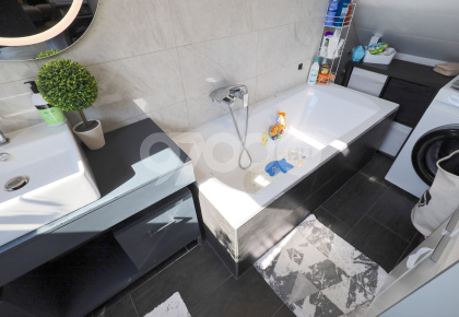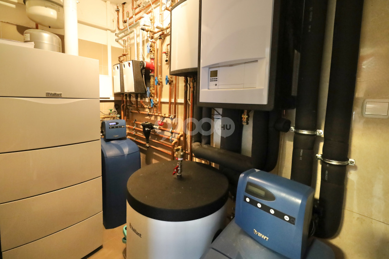 - A ház fűtése: hőszivattyú (H-tarifa), kiegészítésként gázkazán az alsó szinten. A hőleadás a padlón valamint radiátorokon keresztül történik. A fenti lakrész fűtése önálló rendszeren keresztül valósul meg, külön gázkazánról.