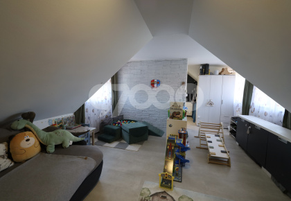 Az 1414 m²-es telek lehetőséget nyújtott arra, hogy a földszint + tetőtér beépítésével egy olyan 332 m²-es lakóház épüljön, ahol a családi élet és akár egy vállalkozás is zavartalanul működhessen egymás mellett.