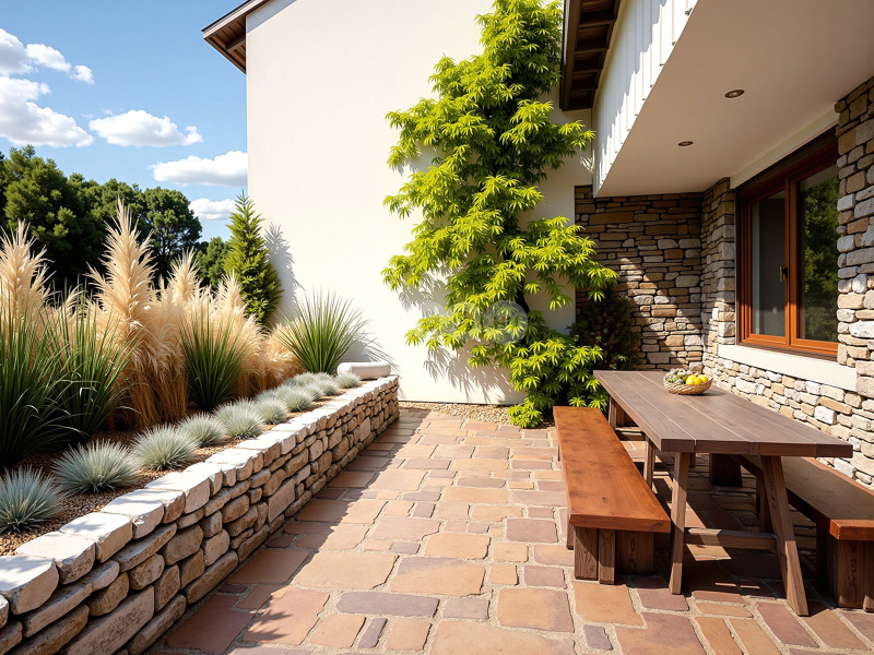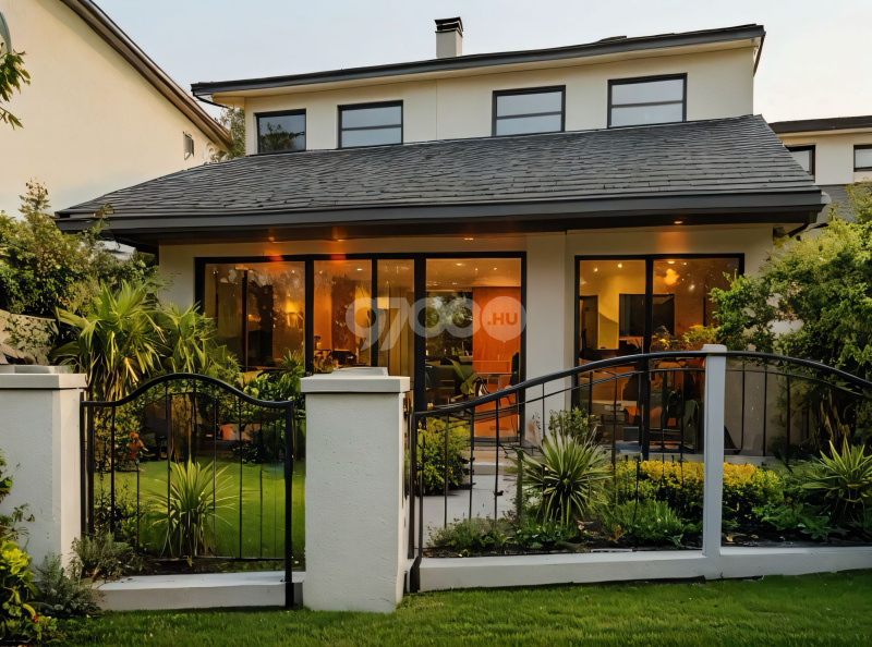 A házhoz gazdag növényzetű előkert és intim hátsókert tartozik, mindkét oldalon terasszal, az emeletről pedig a kérte néző, nyugati erkély nyílik.