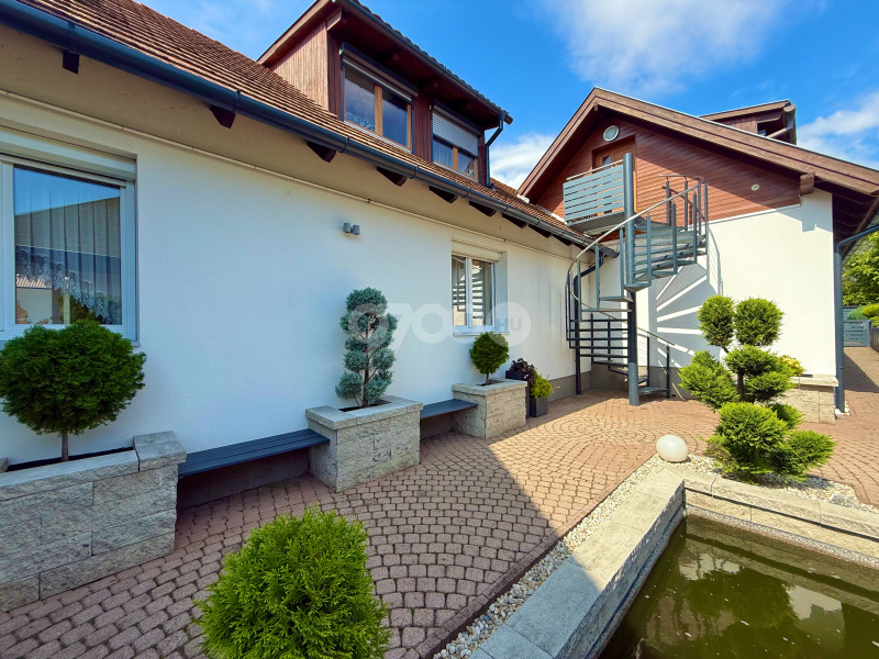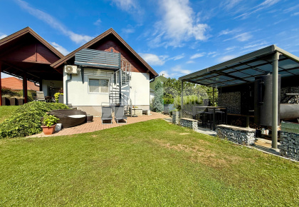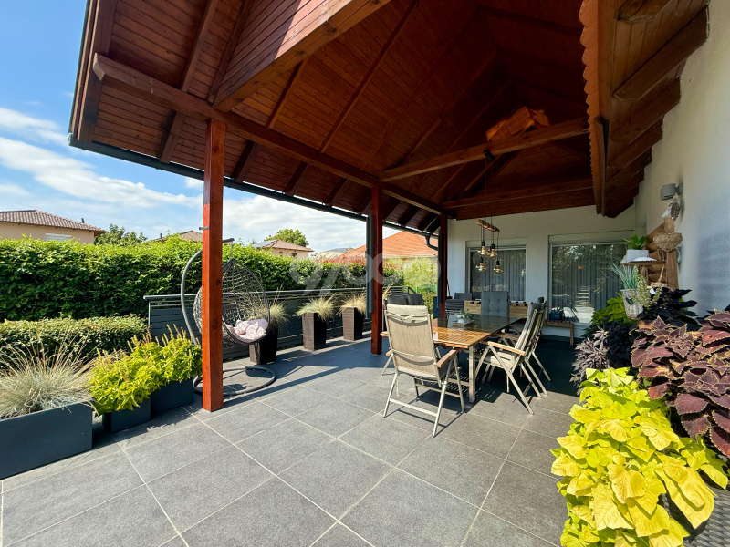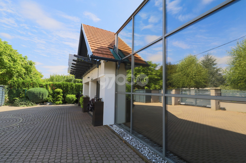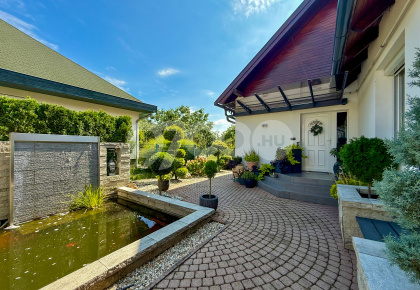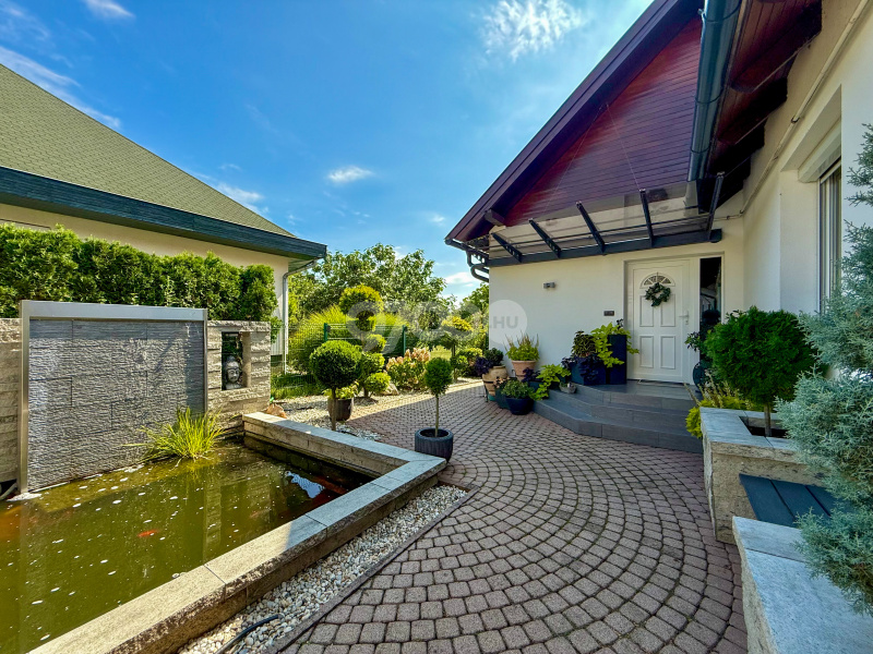 Külön említést érdemel az ingatlan parkosított kertje, mely az utcai bejárattól kezdve a leghátsó kerítésig harmonikus egységet képez, kiemelve a ház bejáratához közeli csobogót. A funkcionalitás kültéren is megjelenik: a szükséges felületeken térkő, a szabadidő természetbeni eltöltésére szépen gondozott gyep, fedett és nyitott terasz biztosít teret.