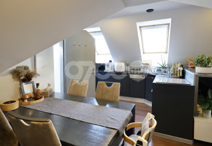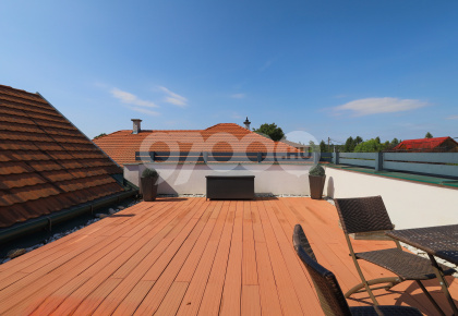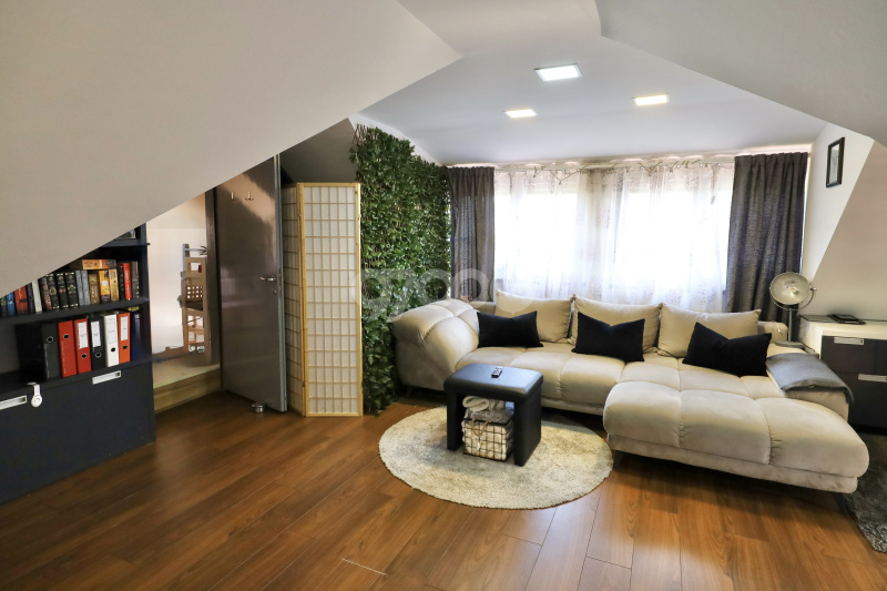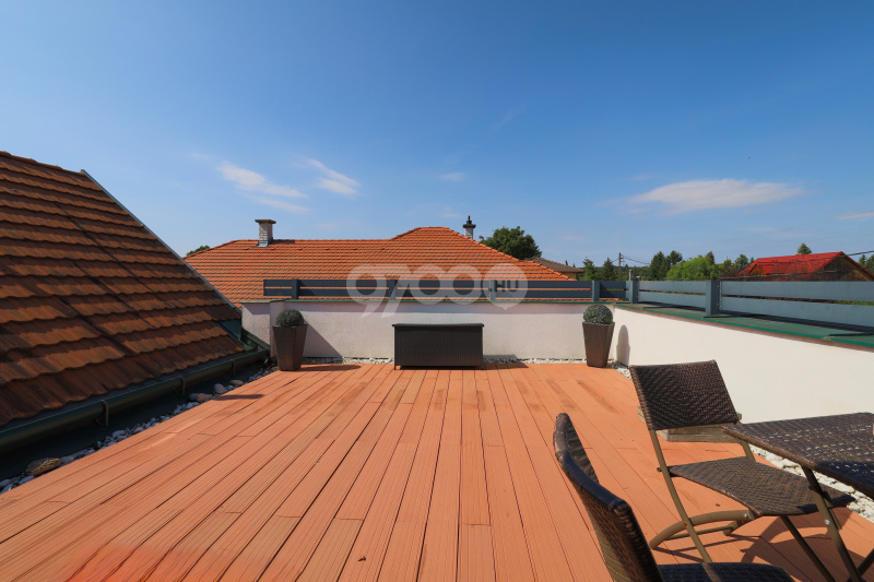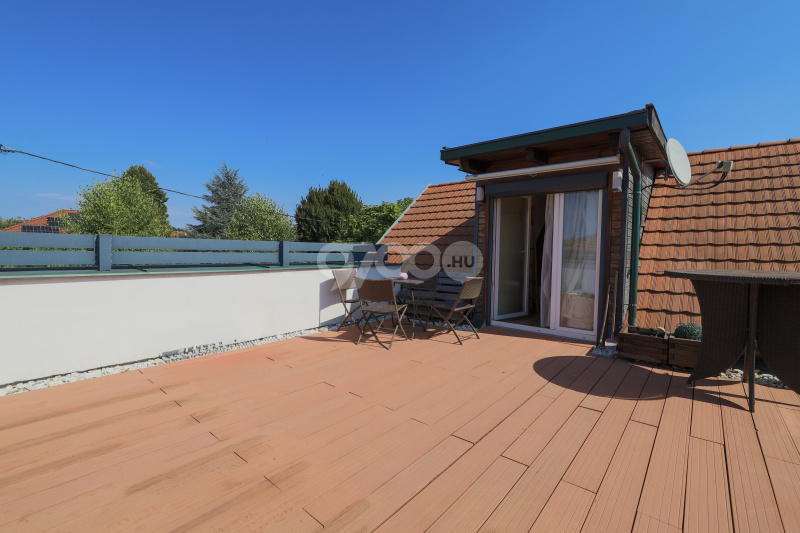 AZ INGATLAN EGYEDISÉGE a ház első részének tetőterében kialakított, teljesen elkülönített, saját bejáratú lakóegységben rejlik. Jelenleg egy nappali - konyha - étkezős + 2 hálószobás lakásként funkcionál, melyben található egy fürdőszoba WC-vel, valamint egy, a szobából nyíló napfényes privát 30 m²-es tetőterasz!